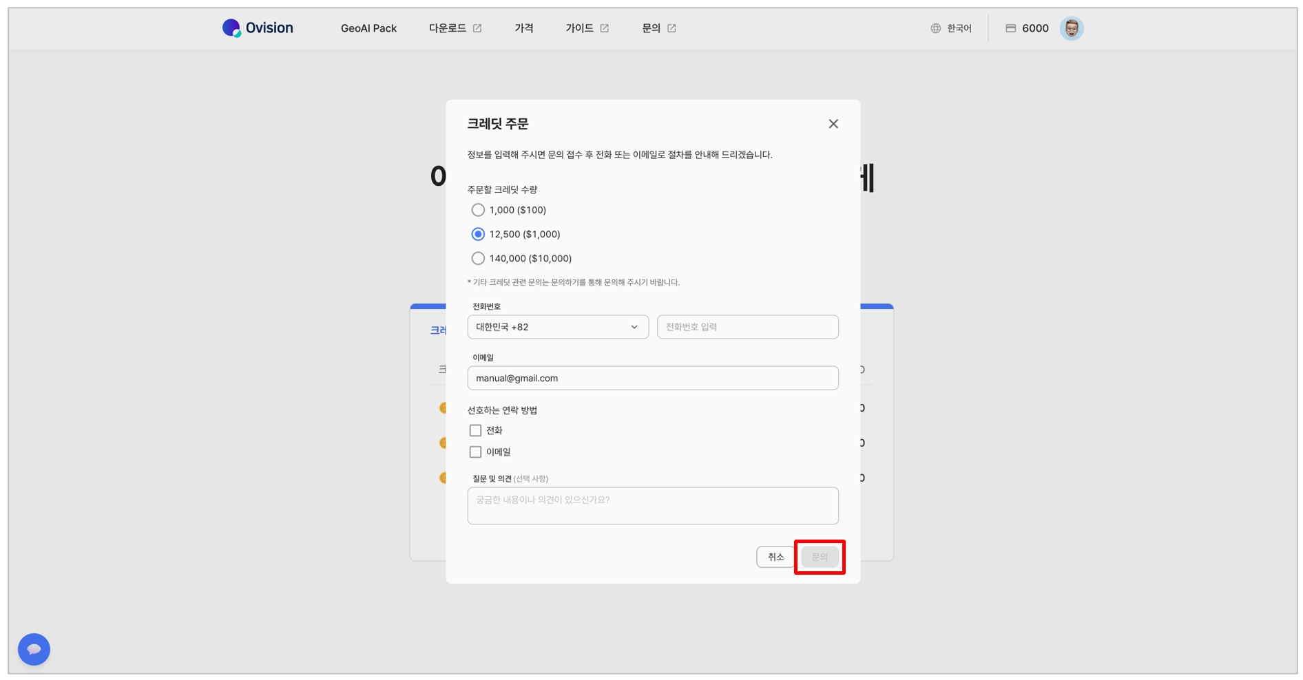 크레딧 주문 폼에 정보를 입력하고 '문의' 버튼을 클릭합니다.