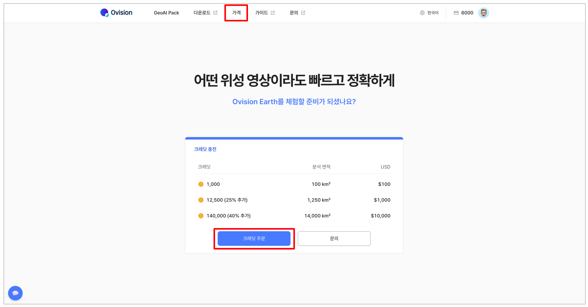 화면 상단의 [가격] 메뉴를 클릭하고, [크레딧 주문] 버튼을 클릭합니다.