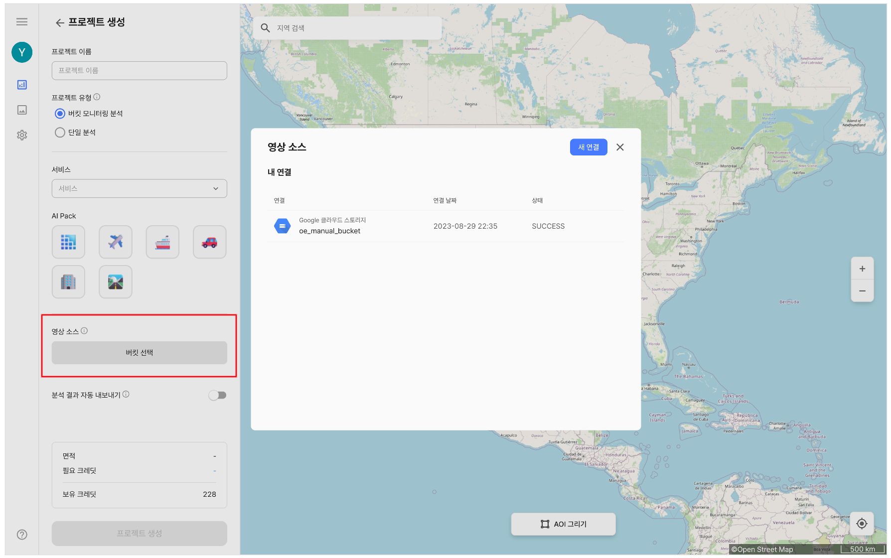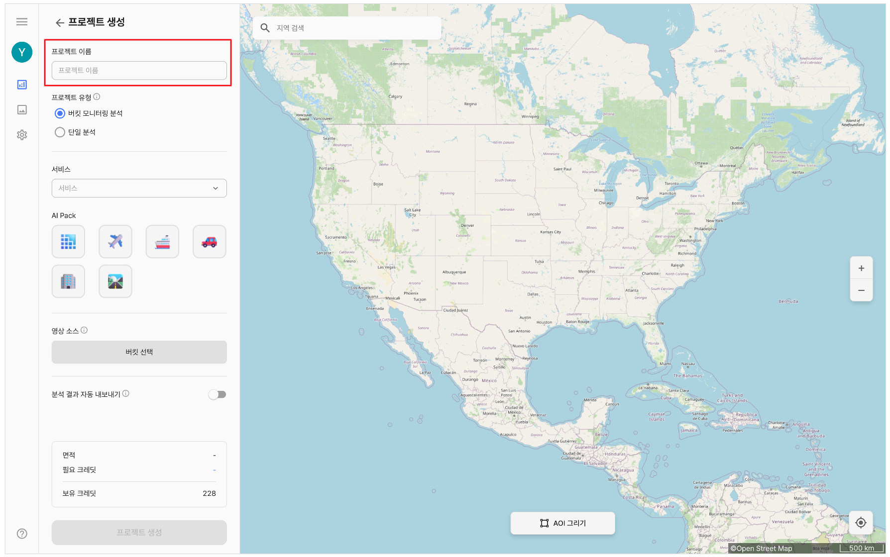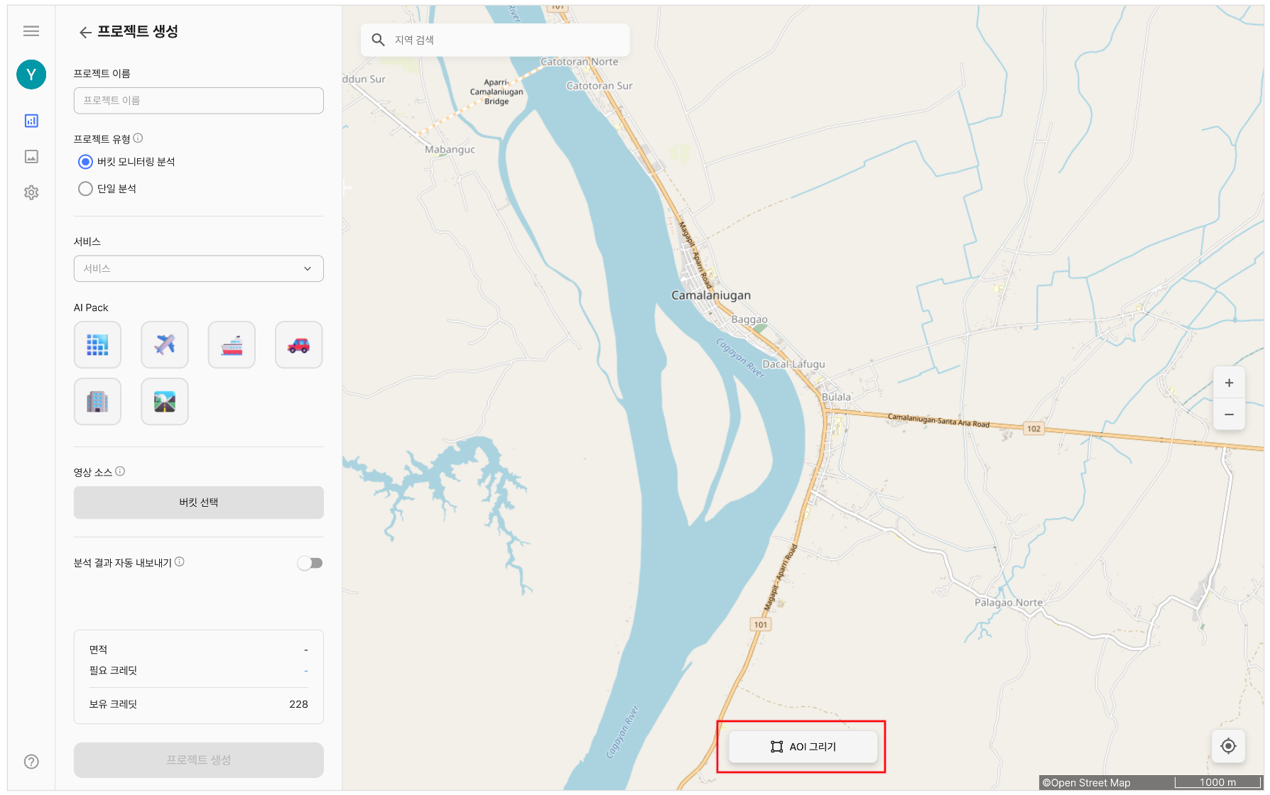 안내 AI Pack으로 분석하고자 하는 관심영역(AOI, Area of Interest)을 지정합니다. '버킷 모니터링 분석' 유형의 프로젝트에서 AOI를 지정하는 것은 '선택 사항'이며, AOI를 지정하지 않으면 영상 단위로 분석을 수행합니다. AOI는 면적 100 km² 이하로만 지정할 수 있습니다. (단, Image Improvement 서비스의 SuperX AI Pack은 영상 단위로만 분석이 가능합니다.)
