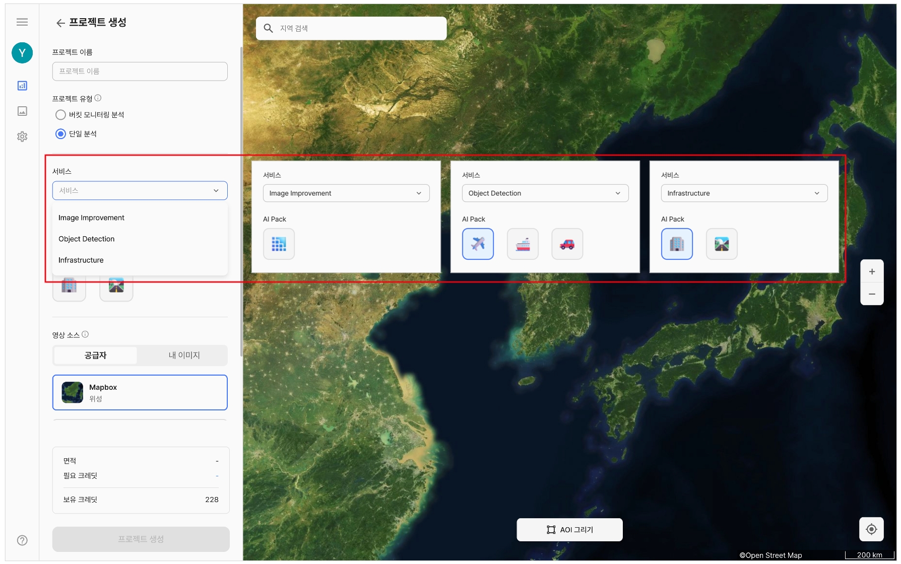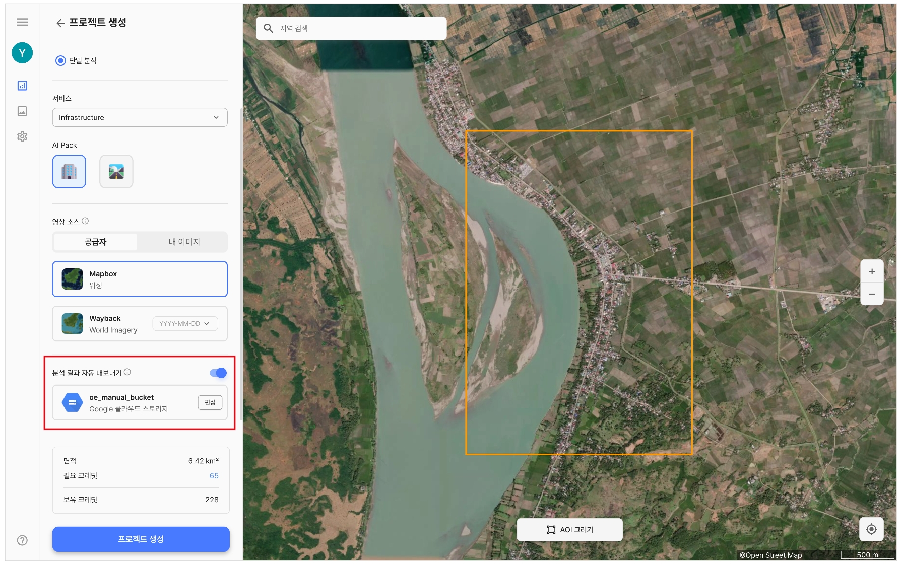 화면 좌측 하단에서 지정한 영역의 '면적'과 '필요 크레딧' 정보를 확인합니다.