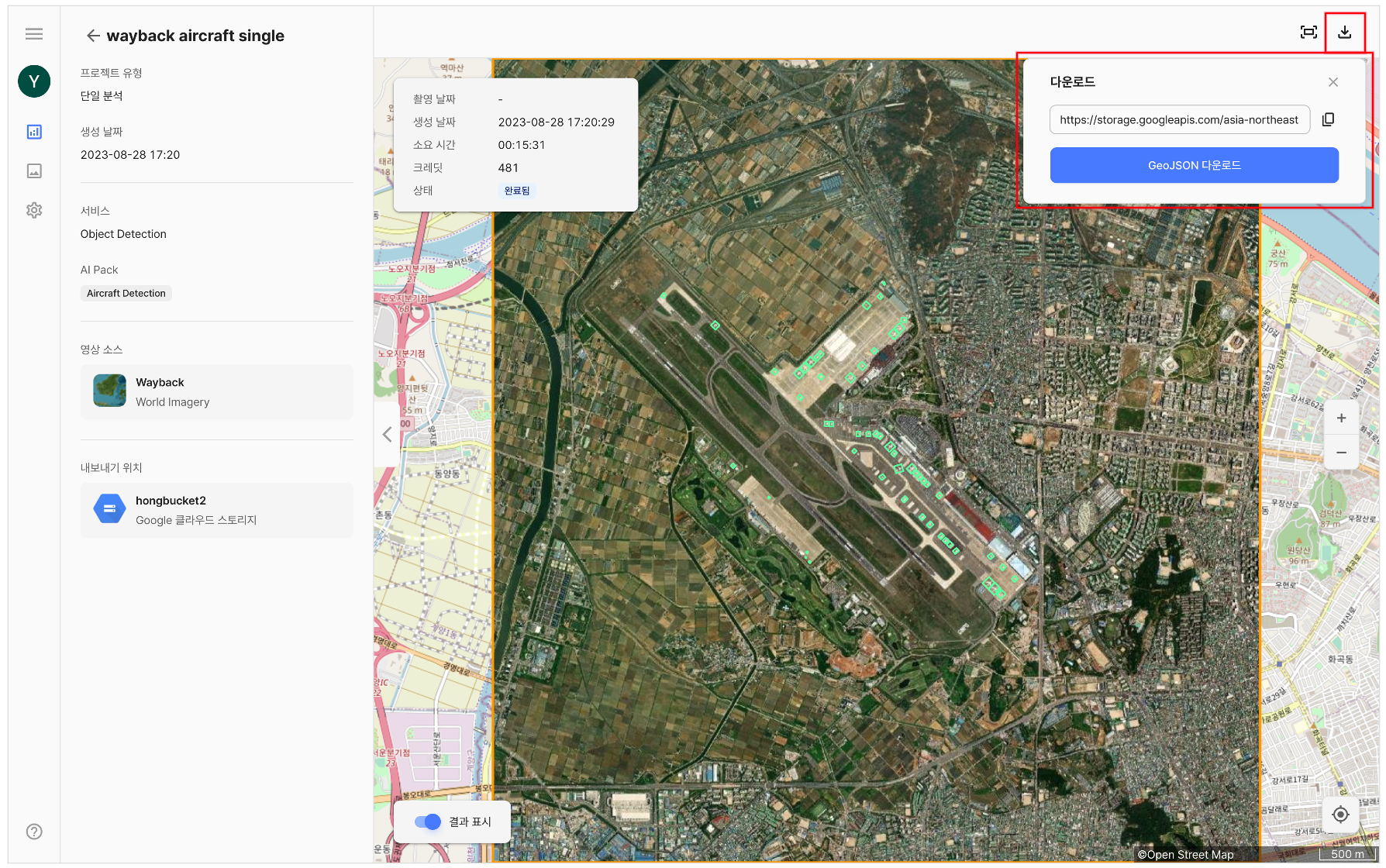 안내 프로젝트 상세 화면 우측 상단의 '다운로드' 버튼을 클릭하여 분석 결과를 저장할 수 있습니다.