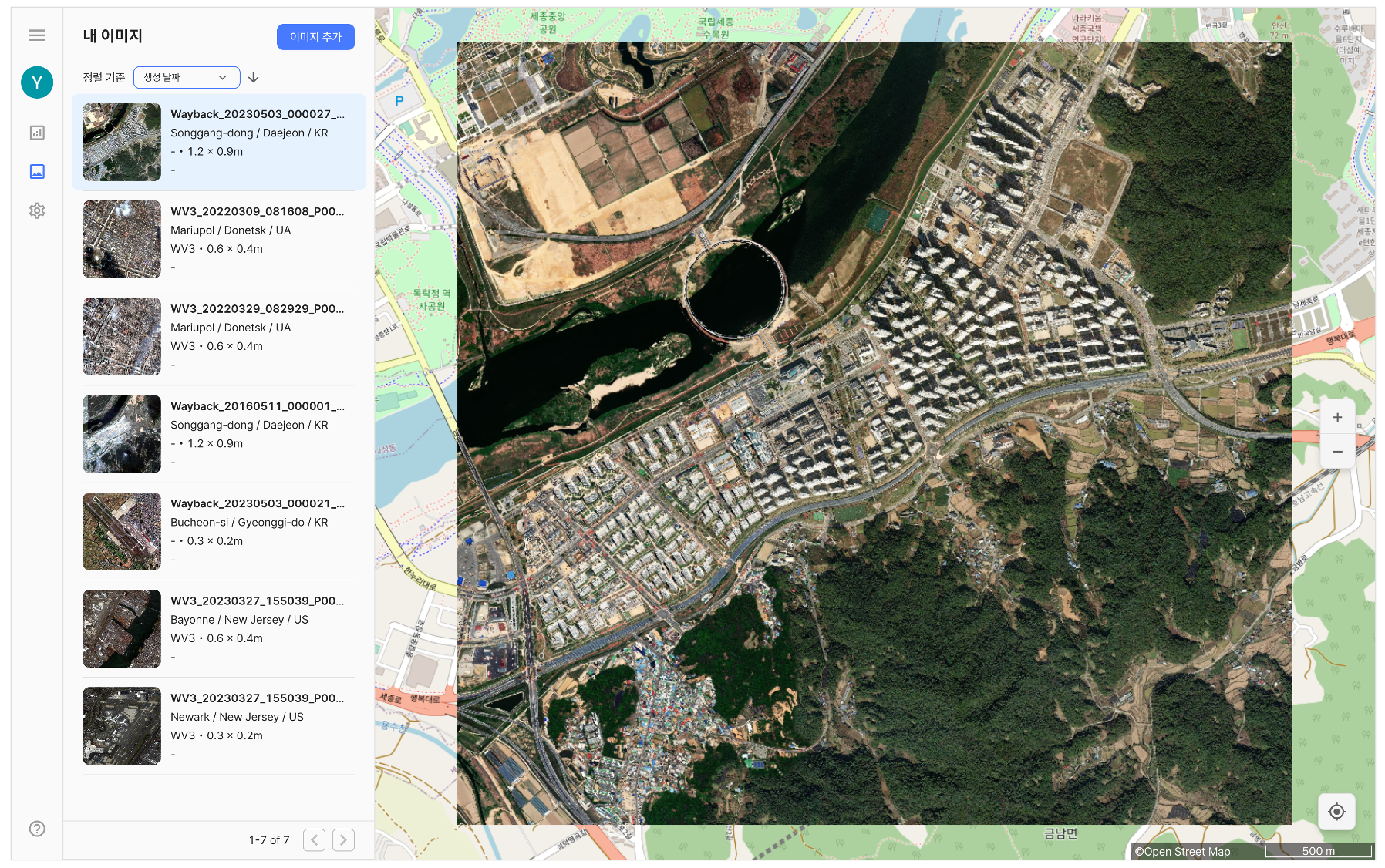 안내 영상 목록에서 영상을 선택하면 해당 영상의 위치로 지도가 이동하여 확대됩니다. 지도를 이동하거나 확대/축소하여 영상 이미지를 상세하게 확인할 수 있습니다.